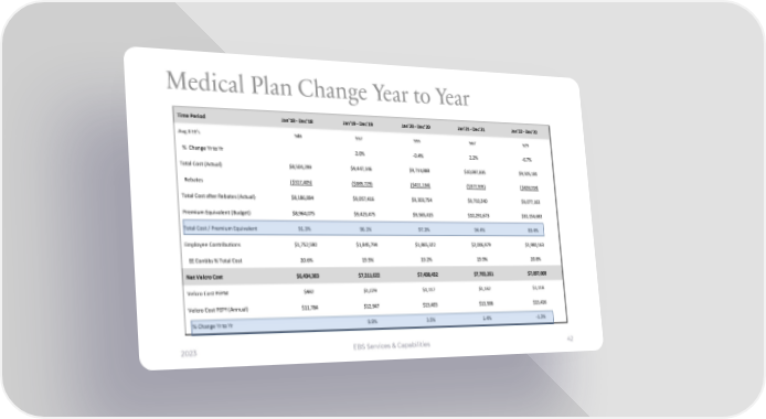 Medical Plan Change Year to Year Time Period Jan'18 - Dec'18 Jan'19 - Dec'19 Jan'20 - Dec'20 Jan'21 - Dec'21 Jan'22 - Dec'22 Avg # EE's 546 557 555 567 529 % Change Yr to Yr 2.0% -0.4% 2.2% -6.7% Total Cost (Actual) $8,504,299 $9,447,146 $9,714,888 $10,087,835 $9,505,181 Rebates ($317,405) ($389,729) ($411,134) ($377,595) ($428,018) Total Cost after Rebates (Actual) $8,186,894 $9,057,416 $9,303,754 $9,710,240 $9,077,163 Premium Equivalent (Budget) $8,964,075 $9,423,475 $9,565,415 $10,291,673 $10,154,683 Total Cost / Premium Equivalent 91.3% 96.1% 97.3% 94.4% 89.4% Employee Contributions $1,752,590 $1,845,794 $1,865,322 $2,006,979 $1,980,163 EE Contibs % Total Cost 20.6% 19.5% 19.2% 19.9% 20.8% Net Velcro Cost $6,434,303 $7,211,622 $7,438,432 $7,703,261 $7,097,000 Velcro Cost PEPM $982 $1,079 $1,117 $1,132 $1,118 Velcro Cost PEPY (Annual) $11,784 $12,947 $13,403 $13,586 $13,416 % Change Yr to Yr 9.9% 3.5% 1.4% -1.3% 2023 EBS Services & Capabilities 42