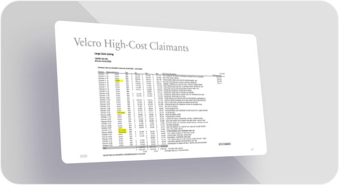 Velcro High-Cost Claimants Large Claim Listing VELCRO USA INC. Effective 01/01/2022 Claimants with over $50,000 in claims for 01/01/2022 -12/31/2022 $210,000 Claimant RelationshipStatus Plan Oct. Nov. Dec. ICD-9 Code Description Reimbursement Claimant 1 SP Active HSA $ 355,706 $ 361,463 $ 372,115 TYPE 2 DIABETES W DIABETIC PERIPHERAL ANGIOPATHY W GANGRENE $162,115 Claimant 2 EE Active HRA $ 218,797 $ 247,553 $ 279,486 END STAGE RENAL DISEASE $69,486 Claimant 3 SP Active HRA $ 203,640 $ 235,241 $ 254,796 TRAUM SUBRAC HEM W/O LOSS OF CONSCIOUSNESS, INIT $44,796 Claimant 4 EE COBRA HRA $ 208,171 $ 225,507 $ 244,177 MULTIPLE MYELOMA NOT HAVING ACHIEVED REMISSION $34,177 Claimant 5 EE Active HSA $ 161,807 $ 177,952 $ 194,451 CHRONIC LYMPHOCYTIC LEUK OF B-CELL TYPE NOT ACHIEVE REMIS Claimant 6 EE Active HSA $ 176,163 $ 177,842 $ 179,446 INFECT/INFLM REACTION DUE TO INTERNAL RIGHT HIP PROSTH, INIT Claimant 7 EE Active HRA $ 131,609 $ 172,645 $ 173,429 UNSP FRACTURE OF NAVICULAR BONE OF RIGHT WRIST, INIT Claimant 8 EE Active HRA $ 119,111 $ 119,865 $ 125,540 SECONDARY MALIGNANT NEOPLASM OF BRAIN Claimant 9 EE Active HRA $ 88,092 $ 123,115 MALIGNANT NEOPLASM OF TRIGONE OF BLADDER Claimant 10EE Active HSA $ 111,679 $ 112,493 $ 117,249 MALIGNANT NEOPLASM OF LOWER LOBE, LEFT BRONCHUS OR LUNG Claimant 11EE Active HRA $ 110,155 $ 114,293 $ 115,250 MALIGNANT NEOPLASM OF CECUM Claimant 12EE Active HSA $ 115,005 OTHER SEQUELAE OF NONTRAUMATIC INTRACEREBRAL HEMORRHAGE Claimant 13CH Active HSA $ 109,155 $ 110,474 $ 111,184 ARNOLD-CHIARI SYNDROME WITH SPINA BIFIDA AND HYDROCEPHALUS Claimant 14SP Active HRA $ 97,949 $ 98,508 $ 104,188 NON-ST ELEVATION (NSTEMI) MYOCARDIAL INFARCTION Claimant 15SP Active HRA $ 95,428 $ 101,078 $ 101,985 STEMI INVOLVING OTH CORONARY ARTERY OF ANTERIOR WALL Claimant 16EE Active HRA $ 75,096 $ 99,972 $ 99,972 MULTIPLE SCLEROSIS Claimant 17SP Active HSA $ 67,864 $ 98,465 $ 99,035 ACUTE CHOLECYSTITIS Claimant 18SP Active HSA $ 93,324 $ 93,551 $ 96,367 INTERVERTEBRAL DISC DISORDERS W RADICULOPATHY, LUMBAR REGION Claimant 19EE Terminated HRA $ 91,173 $ 91,173 $ 90,724 OTHER MALAISE ` Claimant 20SP Active HSA $ 53,962 $ 78,538 $ 88,734 POLYP OF CORPUS UTERI Claimant 21CH Active HSA $ 80,515 $ 88,225 $ 88,603 COMPRESSION OF BRAIN Claimant 22SP Active HSA $ 61,620 $ 61,963 $ 82,326 ULCERATIVE COLITIS, UNSPECIFIED, WITHOUT COMPLICATIONS Claimant 23CH Active HSA $ 75,598 $ 80,283 $ 81,099 LOCAL-REL SYMPTC EPI W CMPLX PART SEIZ, NTRCT, W/O STAT EPI Claimant 24SP Active HSA $ 76,488 $ 76,488 $ 76,488 INTERVERTEBRAL DISC DISORDERS W MYELOPATHY, THORACIC REGION Claimant 25EE Active HSA $ 68,048 $ 73,473 $ 74,175 MULTIPLE SCLEROSIS Claimant 26SP Active HSA $ 58,806 $ 62,636 $ 70,476 NON-PRS CHRONIC ULC UNSP PRT OF L LOW LEG W UNSP SEVERITY Claimant 27EE Terminated HRA $ 70,009 END STAGE RENAL DISEASE Claimant 28CH Terminated HSA $ 61,161 $ 61,161 $ 61,161 OTHER SPECIFIED JOINT DISORDERS, RIGHT HIP Claimant 29SP Active HSA $ 59,161 $ 59,506 $ 60,898 TYPE 2 DIABETES MELLITUS WITH FOOT ULCER Claimant 30SP Active HSA $ 53,102 $ 56,253 $ 59,364 UTEROVAGINAL PROLAPSE, UNSPECIFIED Claimant 31SP Active HSA $ 55,958 $ 57,767 PNEUMONIA, UNSPECIFIED ORGANISM Claimant 32SP Active HSA $ 55,009 $ 55,924 $ 56,274 TYPE 2 DIABTES MELLITUS WITH HYPOGLYCEMIA WITHOUT COMA Claimant 33SP Active HSA $ 53,036 $ 53,352 $ 55,529 UNILATERAL PRIMARY OSTEOARTHRITIS, LEFT HIP Claimant 34SP Active HSA $ 51,540 $ 51,815 $ 52,114 DIAPHRAGMATIC HERNIA WITHOUT OBSTRUCTION OR GANGRENE Total $ 3,234,874 $ 3,641,741 $4,032,527 $ 310,574 $ 6,815,397 $ 7,693,439 $ 8,369,285 Total Paid Claims (gross) 47.5% 47.3% 48.2%High Claimants / Total Paid Claims 2023 Specific Stop Loss Deductible is $210,000 (Symetra is reinsurer) 47
