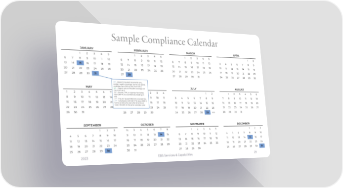 Sample Compliance Calendar JANUARY FEBRUARY MARCH APRIL 1 2 3 4 5 1 2 3 4 5 1 2 3 4 5 1 2 6 7 8 9 10 11 12 6 7 8 9 10 11 12 6 7 8 9 10 11 12 3 4 5 6 7 8 9 13 14 15 16 17 18 19 13 14 15 16 17 18 19 13 14 15 16 17 18 19 10 11 12 13 14 15 16 20 21 22 23 24 25 26 20 21 22 23 24 25 26 20 21 22 23 24 25 26 17 18 19 20 21 22 23 27 28 29 30 31 27 28 27 28 29 30 31 24 25 26 27 28 29 30 st 31 –Report imputed income for GTL, certain health coverage, some LTD plans, and Dep Care FSA on the Form W-2 MAY st JUNE JULY AUGUST 31 –Report value of health coverage on the Form W-2 st 1 2 3 4 5 6 7 31 –Insurer, TPA, or sponsor furnishes 1 2 3 4 5 6 1 2 3 4 1 2 MA 1099-HC to covered EEs residing in 8 9 10 11 12 13 14 MA 5 6 7 8 9 10 11 3 4 5 6 7 8 9 7 8 9 10 11 12 13 st 31 –Insurer issues 1095-B to covered EEs st 15 16 17 18 19 20 21 31 –Employers with 50+ FTE issue 1095-C 14 15 16 17 18 19 20 12 13 14 15 16 17 18 10 11 12 13 14 15 16 forms to EEs who were full time for at 22 23 24 25 26 27 28 least 1 month in the prior calendar year 21 22 23 24 25 26 27 19 20 21 22 23 24 25 17 18 19 20 21 22 23 29 30 31 26 27 28 29 30 24 25 26 27 28 29 30/31 28 29 20 31 SEPTEMBER OCTOBER NOVEMBER DECEMBER 1 2 3 ½ 3 4 5 6 7 8 1 2 3 4 5 1 2 3 4 5 6 7 8 9 10 9 10 11 12 13 14 15 6 7 8 9 10 11 12 4 5 6 7 8 9 10 11 12 13 14 15 16 17 16 17 18 19 20 21 22 13 14 15 16 17 18 19 11 12 13 14 15 16 17 18 19 20 21 22 23 24 23 24 25 26 27 28 29 20 21 22 23 24 25 26 18 19 20 21 22 23 24 25 26 27 28 29 30 30 31 27 28 29 30 25 26 27 28 29 30 31 2023 EBS Services & Capabilities 29