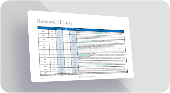 Renewal History Year Initial Final UBA UBA Comments Renewal Renewal Initial Final Specific stop loss deductible increase to $230K level at -18.9% to $142.18. Admin. fee rate hold for stop loss move back to Cigna. Third year of 3-year 2023 2.0% 0.0% PBM deal with rebate share at 100%.Added OAPIN higher deductible plan for choice. Employee contributions increased 0% and OAPIN a 33% decrease. 2022 6.0% 6.0% 9.3% 6.2% Specific stop loss renewed at $210K level at +68.8% to $175.28. Admin. fee increased 1.5%. Second year of 3-year PBM deal with rebate share at 100%. No plan changes. Employee contributions increased 6% for all tiers of coverage. 2021 9.1% 6.0% 8.7% 5.0% Specific stop loss deductible increase to $210K taking a +16% to -9.7% to $55.34/$154.20 by changing SL carrier to Symetra. Negotiated 3-year PBM deal with rebate share increased to 100%. No plan changes. Employee contributions increased 6% for all tiers of coverage. 2020 6.3% 6.0% 9.7% 5.5% Specific stop loss deductible increase to $200K taking a +15% to -1%to $115.01. Rebate share remained at 90%. No plan changes. Health Matters Care Mgmt Preferred added. Employee contributions increased 6% EE only, 1.5% EE/Sp, 1% EE/CH & 9.8% Family. 2019 5.5% 5.5% 8.6% 4.6% Specific stop loss renewed at $175K level at +20% to $116.13. Rebate share remained at 90%. Plan change to brand name Rx drug copays. Employee contributions increased 5.5% EE only, 3% EE/Sp, 1% EE/CH & 8% Family. Cigna admin fee reduced by $0.50 PEPM because Telehealth is now no extra charge. Specific stop loss renewed at $175K level at +13% to $96.78. 2018 8.7% 8.7% 14.0% 9.8% Rebate share remained at 90%. No plan changes. Employee contributions changed from 2 tier to 4 tier (increases 8.7% EE only, 7.5% EE/Sp, 5.5% EE/CH & 10% Family to ease change for non-singles). 2017 5.0% 1.0% 11.2% 6.2% Change from Aetna to Cigna. Admin fee was a -12.2% to $37.81. Specific stop loss renewed at $175K level at a -20.3% to $85.65. Rebate share remained at 90%. No plan changes. 2016 4.6% 4.6% 10.5% 5.9% Admin fee was a 2.0% to $43.04. Specific stop loss renewed at $175K level at a 5% increase to $107.48. Rebate share remained at90%. No plan changes. 2015 7.5% 7.5% 11.2% 6.2% Admin fee was a 1.5% to $42.20. Specific stop loss renewed back at $175K level at a no change (no laser). Rebate share remained at 90%. 10/1/13 14.4% 9.3% 10.6% 5.6% 15 month stop loss renewal period to get plan anniversary date to January 1st. No change to admin. fee. Specific stop loss increased to $200K with one laser at $300K was essential a hold at $102.34. Rebate share increased to 90%. 10/1/12 19.4% 12.8% 10.8% 5.5% Admin fee was a -6.6% to $41.58. Specific stop loss at $175K with one laser at $300K was a -4.1% to $102.31. Rebate share increased to 80%. 10/1/11 19.0% 10.2% 5.0% Admin fee was a +4% to $44.53. Specific stop loss at $175K was a +54.7% to $106.69. Rebate share increased to 60%. Made HRA and HSA plans exactly the same plan design. 5-Yr. Average 5.8% 4.7% 10.1% 6.2% 2023 EBS Services & Capabilities 41