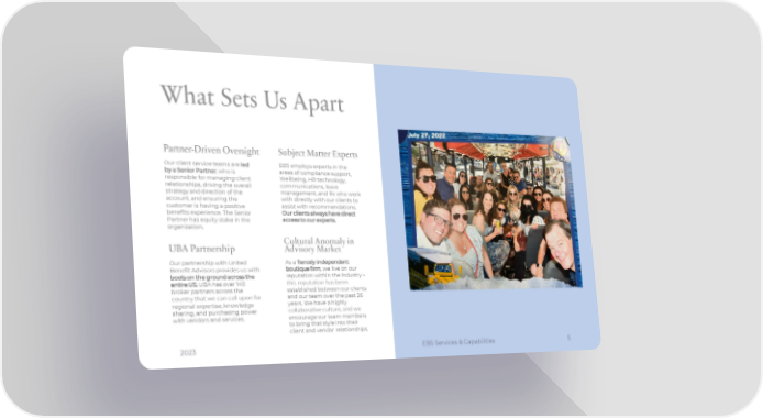 What Sets Us Apart Partner-Driven Oversight Subject Matter Experts Our client service teams areled EBS employs experts in the by a Senior Partner, who is areas of compliance support, responsible for managing client Wellbeing, HR technology, relationships, driving the overall communications, leave strategy and direction of the management, and Rx who work account, and ensuring the with directly with our clients to customer is having a positive assist with recommendations. benefits experience. The Senior Our clients always have direct Partner has equity stake in the access to our experts. organization. UBA Partnership Cultural Anomaly in Advisory Market Our partnership with United As afiercely independent Benefit Advisors provides us with boutique firm, we live on our boots on the ground across the reputation within the industry – entire US.UBA has over 140 this reputation has been broker partners across the established between our clients country that we can call upon for and our team over the past 26 regional expertise, knowledge years. We have a highly sharing, and purchasing power collaborative culture, and we with vendors and services. encourage our team members to bring that style into their client and vendor relationships. 2023 EBS Services & Capabilities 5