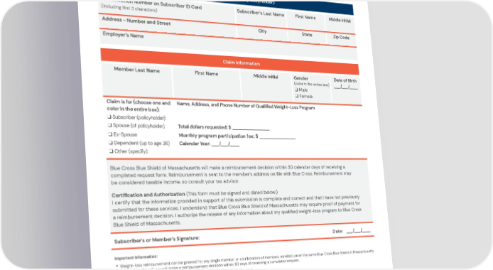 Weight-Loss Reimbursement Request Please Print All Information Clearly: To verify this reimbursement is offered within your plan, or for more information, please sign in to MyBlue at bluecrossma.com/myblue or call the Member Service number on your ID card. All weight-loss reimbursement requests must be submitted by March 31 of the following year. Complete this form and mail it to: Blue Cross Blue Shield of Massachusetts, Local Claims Department , PO Box 986030, Boston, MA 02298 Subscriber Information (Policyholder) Identification Number on Subscriber ID Card Subscriber’s Last Name First Name Middle Initial (including first 3 characters) Address - Number and Street City State Zip Code Employer’s Name Claim Information Date of Birth Member Last Name First Name Middle Initial Gender (color in the entire box) ___/___/____ q Male q Female Claim is for (choose one and Name, Address, and Phone Number of Qualified Weight-Loss Program color in the entire box): q Subscriber (policyholder) q Spouse (of policyholder) Total dollars requested: $ ________________ q Ex-Spouse Monthly program participation fee: $ ________________ q Dependent (up to age 26) Calendar Year: ___/___/____ q Other (specify): Blue Cross Blue Shield of Massachusetts will make a reimbursement decision within 30 calendar days of receiving a completed request form. Reimbursement is sent to the member’s address on file with Blue Cross. Reimbursement may be considered taxable income, so consult your tax advisor. Certification and Authorization (This form must be signed and dated below.) I certify that the information provided in support of this submission is complete and correct and that I have not previously submitted for these services. I understand that Blue Cross Blue Shield of Massachusetts may require proof of payment for a reimbursement decision. I authorize the release of any information about my qualified weight-loss program to Blue Cross Blue Shield of Massachusetts. Subscriber’s or Member’s Signature: Date: ___/___/____ Important Information: • Weight-loss reimbursement can be granted for any single member or combination of members enrolled under the same Blue Cross Blue Shield of Massachusetts health plan. Blue Cross will make a reimbursement decision within 30 days of receiving a completed request. • Reimbursement requests must be submitted by March 31 of the following year. • Keep copies of proof of payment in case we request it from you. Proof of payment includes: • Receipts (cash/check/credit/electronic) for participation fees clearly documenting your name, the weight-loss program name, and individual amounts charged with date paid. • Your weight-loss program membership or participation agreement clearly documenting your name and date of enrollment/participation. • Your reimbursement may be considered taxable income, so consult a tax advisor. Blue Cross Blue Shield of Massachusetts complies with applicable federal civil rights laws and does not discriminate on the basis of race, color, national origin, age, disability, sex, sexual orientation, or gender identity. ATTENTION: If you don’t speak English, language assistance services, free of charge, are available to you. Call Member Service at the number on your ID card (TTY: 711). ATENCIÓN: Si habla español, tiene a su disposición servicios gratuitos de asistencia con el idioma. Llame al número de Servicio al Cliente que figura en su tarjeta de identificación (TTY: 711). ATENÇÃO: Se fala português, são-lhe disponibilizados gratuitamente serviços de assistência de idiomas. Telefone para os Serviços aos Membros, através do número no seu cartão ID (TTY: 711). 000414912 55-0774 (5/20) ® Registered Marks of the Blue Cross and Blue Shield Association. ®´ Registered Marks and TM Trademarks are the property of their respective owners. © 2020 Blue Cross and Blue Shield of Massachusetts, Inc., and Blue Cross and Blue Shield of Massachusetts HMO Blue, Inc.