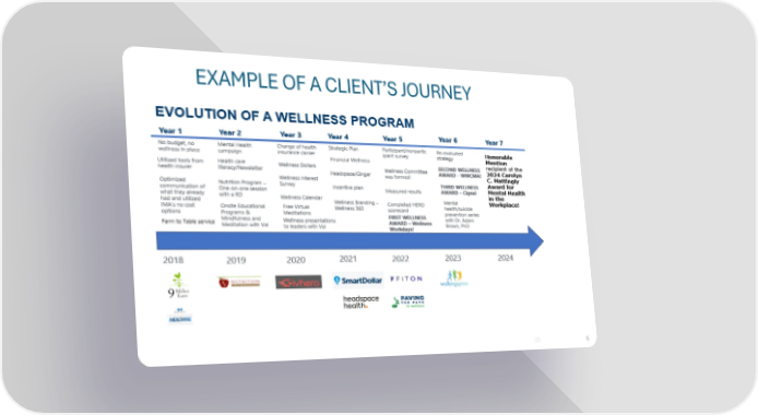 2018 No budget, no wellness in place Utilized tools from health insurer Optimized communication of what they already had and utilized IMA’s no cost options 2019 2020 2021 2022 2023 Mental Health campaign Health care literacy/Newsletter Nutrition Program – One-on-one session with a RD Change of health insurance carrier Wellness Dollars Wellness Interest Survey Wellness Calendar Strategic Plan Financial Wellness Headspace/Ginger Virtual Meditation Incentive plan Participant/nonpartic ipant survey Wellness Committee was formed! Measured results Completed HERO scorecard FIRST WELLNESS AWARD – Wellness Workdays! Re-evaluated strategy SECOND WELLNESS AWARD – WWCMA! THIRD WELLNESS AWARD – Cigna! EVOLUTION OF A WELLNESS PROGRAM Year 1 Year 2 Year 3 Year 4 Year 5 Year 6 25 6 EXAMPLE OF A CLIENT’S JOURNEY