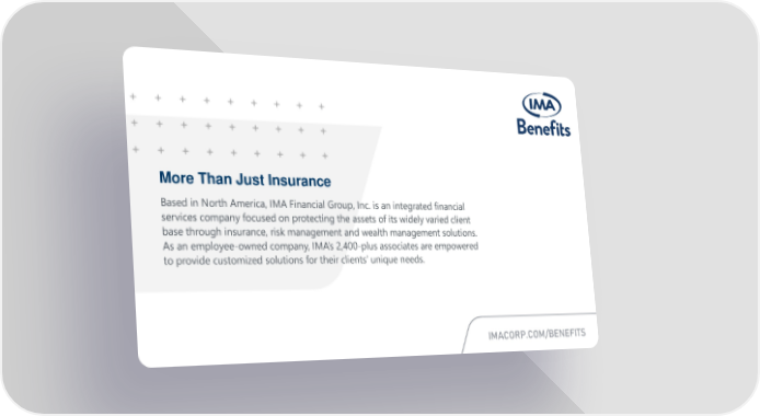 More Than Just Insurance Based in North America, IMA Financial Group, Inc. is an integrated financial services company focused on protecting the assets of its widely varied client base through insurance, risk management and wealth management solutions. As an employee-owned company, IMA’s 2,400-plus associates are empowered to provide customized solutions for their clients’ unique needs. IMACORP.COM/BENEFITS