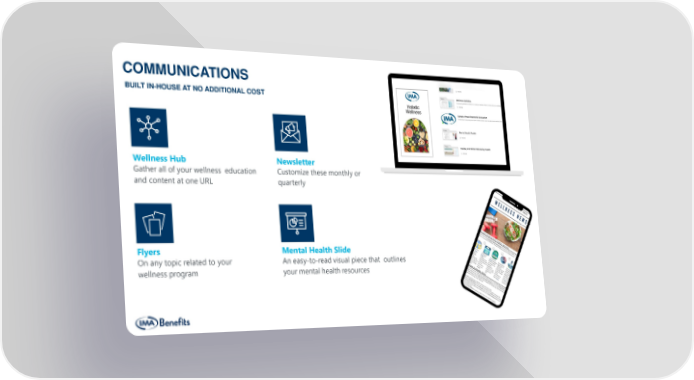 Wellness Hub Gather all of your wellness education and content at one URL Newsletter Customize these monthly or quarterly Flyers On any topic related to your wellness program Mental Health Slide An easy-to-read visual piece that outlines your mental health resources COMMUNICATIONS BUILT IN-HOUSE AT NO ADDITIONAL COST