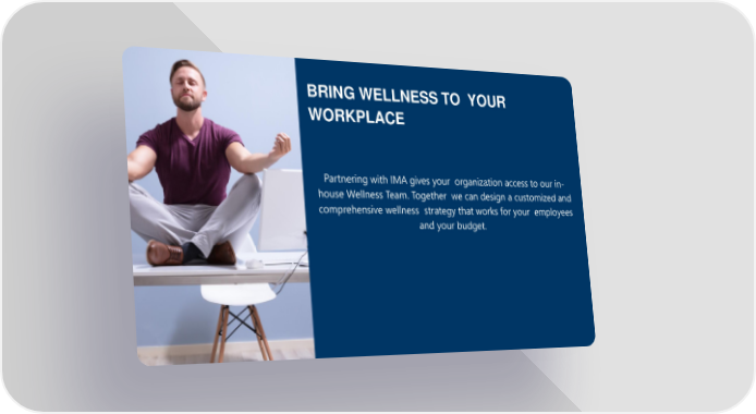 BRING WELLNESS TO YOUR WORKPLACE Partnering with IMA gives your organization access to our in- house Wellness Team. Together we can design a customized and comprehensive wellness strategy that works for your employees and your budget.