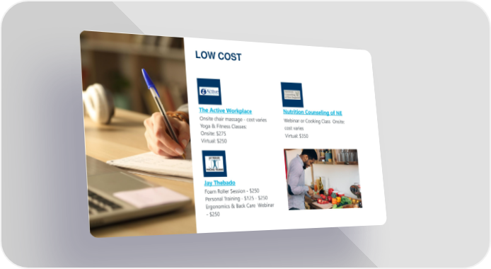 LOW COST The Active Workplace Onsite chair massage - cost varies Yoga & Fitness Classes: Onsite: $275 Virtual: $250 Nutrition Counseling of NE Webinar or Cooking Class Onsite: cost varies Virtual: $350 Jay Thebado Foam Roller Session - $250 Personal Training - $125 - $250 Ergonomics & Back Care Webinar - $250