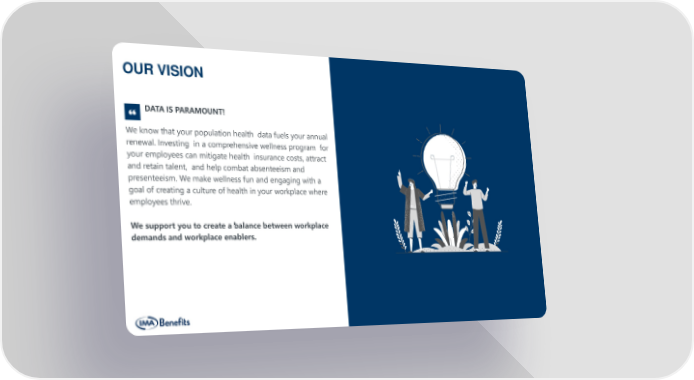 OUR VISION DATA IS PARAMOUNT! We know that your population health data fuels your annual renewal. Investing in a comprehensive wellness program for your employees can mitigate health insurance costs, attract and retain talent, and help combat absenteeism and presenteeism. We make wellness fun and engaging with a goal of creating a culture of health in your workplace where employees thrive. We support you to create a balance between workplace demands and workplace enablers.