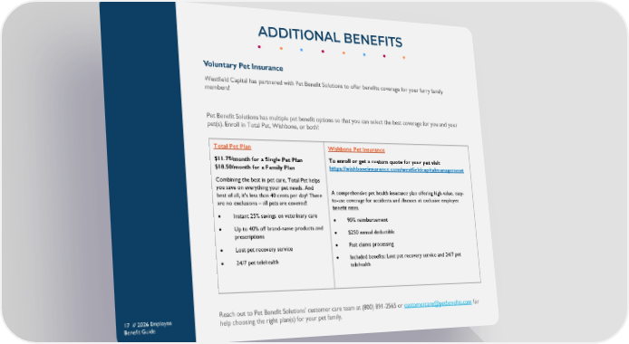 Voluntary Pet Insurance Westfield Capital has partnered with Pet Benefit Solutions to offer benefits coverage for your furry family members! Pet Benefit Solutions has multiple pet benefit options so that you can select the best coverage for you and your pet(s). Enroll in Total Pet, Wishbone, or both! Reach out to Pet Benefit Solutions’ customer care team at (800) 891-2565 or customercare@petbenefits.com for help choosing the right plan(s) for your pet family. ADDITIONAL BENEFITS 17 // 2026 Employee Benefit Guide Total Pet Plan $11.75/month for a Single Pet Plan $18.50/month for a Family Plan Combining the best in pet care, Total Pet helps you save on everything your pet needs. And best of all, it's less than 40 cents per day! There are no exclusions – all pets are covered! • Instant 25% savings on veterinary care • Up to 40% off brand-name products and prescriptions • Lost pet recovery service • 24/7 pet telehealth Wishbone Pet Insurance To enroll or get a custom quote for your pet visit https://wishboneinsurance.com/westfieldcapitalmanagement A comprehensive pet health insurance plan offering high-value, easy- to-use coverage for accidents and illnesses at exclusive employee benefit rates. • 90% reimbursement • $250 annual deductible • Fast claims processing • Included benefits: Lost pet recovery service and 24/7 pet telehealth