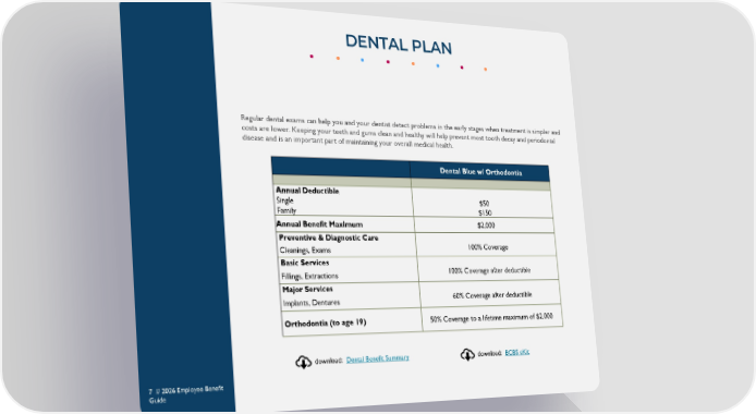 Dental Blue w/ Orthodontia Annual Deductible Single $50 Family $150 Annual Benefit Maximum $2,000 Preventive & Diagnostic Care 100% Coverage Cleanings, Exams Basic Services 100% Coverage after deductible Fillings, Extractions Major Services 60% Coverage after deductible Implants, Dentures Orthodontia (to age 19) 50% Coverage to a lifetime maximum of $2,000 Regular dental exams can help you and your dentist detect problems in the early stages when treatment is simpler and costs are lower. Keeping your teeth and gums clean and healthy will help prevent most tooth decay and periodontal disease and is an important part of maintaining your overall medical health. DENTAL PLAN 7 // 2026 Employee Benefit Guide download: Dental Benefit Summary download: BCBS eKit
