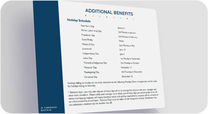 Holiday Schedule New Year’s Day January 1 Martin Luther King Day 3rd Monday in January Presidents’ Day 3rd Monday in February Good Friday Varies Memorial Day Last Monday in May Juneteenth June 19 Independence Day July 4 Labor Day 1st Monday in September *Columbus/Indigenous Day 2nd Monday in October *Veterans’ Day November 11 Thanksgiving Day 4th Thursday in November Christmas Day December 25 Holidays falling on Sunday are normally observed on the following Monday. Other arrangements will be made for holidays falling on Saturday. * Skeleton days—you may take only one of these days off, to be arranged in advance with your manager and other team members. Please notify your manager as to which one of these days you would prefer to be off; where overlapping requests will impact business needs and staffing requirements, requests will be considered on a first-come/first-served basis. Skeleton Days must be taken on the designated holiday. Employees may not substitute a skeleton day for another day off. ADDITIONAL BENEFITS 20 // 2026 Employee Benefit Guide