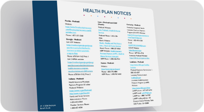 HEALTH PLAN NOTICES 37 // 2026 Employee Benefit Guide Florida - Medicaid Website: https://www.flmedicaidtplrecovery .com/flmedicaidtplrecovery.com/hi pp/index.html Phone: 1-877-357-3268 Georgia - Medicaid GA HIPP Website: https://medicaid.georgia.gov/progr ams/third-party-liability/health- insurance-premium-payment- program-hipp Phone: 678-564-1162 Press 1 GA CHIPRA website: https://medicaid.georgia.gov/progr ams/third-party-liability/childrens- health-insurance-program- reauthorization-act-2009-chipra Phone: 678-564-1162, Press 2 Indiana - Medicaid Health Insurance Premium Payment Program All other Medicaid Website: https://www.in.gov/Medicaid/ http://www.in.gov/fssa/dfr/ Family and Social Services Administration Phone: 1-800-403-0864 Member Services Phone: 1-800-457-4584 Iowa – Medicaid and CHIP (Hawki) Medicaid Website: Iowa Medicaid | Health & Human Services Medicaid Phone: 1-800-338- 8366 Hawki Website: Hawki - Healthy and Well Kids in Iowa | Health & Human Services Hawki Phone: 1-800-257-8563 HIPP Website: Health Insurance Premium Payment (HIPP) | Health & Human Services (iowa.gov) HIPP Phone: 1-888-346-9562 Kansas - Medicaid Website: https://www.kancare.ks.gov/ Phone: 1-800-792-4884 HIPP Phone: 1-800-967-4660 Kentucky - Medicaid Kentucky Integrated Health Insurance Premium Payment Program (KI-HIPP) Website: https://chfs.ky.gov/agencies/dms/me mber/Pages/kihipp.aspx Phone: 1-855-459-6328 Email: KIHIPP.PROGRAM@ky.gov KCHIP Website: https://kynect.ky.gov Phone: 1-877-524-4718 Kentucky Medicaid Website: https://chfs.ky.gov/agencies/dms Louisiana - Medicaid https://www.ldh.la.gov/healthy- louisiana Medicaid Customer Service Line: 1- 888-342-6207 Louisiana Medicaid email: healthy@la.gov Louisiana Health Insurance Premium Program (LaHIPP) Website: https://www.ldh.la.gov/lahipp LaHIPP phone: 1-877-697-6703 LaHIPP email: La.HIPP@la.gov LaHIPP fax: 1-888-716-9787 LaHIPP mailing address: 100 Crescent Centre Parkway, Suite 1000 Tucker, GA 30084