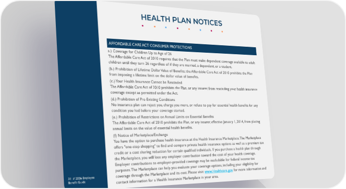 HEALTH PLAN NOTICES 31 // 2026 Employee Benefit Guide AFFORDABLE CARE ACT CONSUMER PROTECTIONS a.) Coverage for Children Up to Age of 26 The Affordable Care Act of 2010 requires that the Plan must make dependent coverage available to adult children until they turn 26 regardless of if they are married, a dependent, or a student. (b.) Prohibition of Lifetime Dollar Value of Benefits: the Affordable Care Act of 2010 prohibits the Plan from imposing a lifetime limit on the dollar value of benefits. (c.) Your Health Insurance Cannot be Rescinded The Affordable Care Act of 2010 prohibits the Plan, or any insurer, from rescinding your health insurance coverage except as permitted under the Act. (d.) Prohibition of Pre-Existing Conditions No insurance plan can reject you, charge you more, or refuse to pay for essential health benefits for any condition you had before your coverage started. (e.) Prohibition of Restrictions on Annual Limits on Essential Benefits The Affordable Care Act of 2010 prohibits the Plan, or any insurer, effective January 1, 2014, from placing annual limits on the value of essential health benefits. (f) Notice of Marketplace/Exchange You have the option to purchase health insurance at the Health Insurance Marketplace. The Marketplace offers "one-stop shopping" to find and compare private health insurance options as well as a premium tax credit or a cost sharing reduction for certain qualified individuals. If you purchase a health plan through the Marketplace, you will lose any employer contribution toward the cost of your health coverage. Employer contributions to employer-provided coverage may be excludable for federal income tax purposes. The Marketplace can help you evaluate your coverage options, including your eligibility for coverage through the Marketplace and its cost. Please visit www.Healthcare.gov for more information and contact information for a Health Insurance Marketplace in your area.