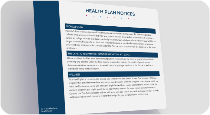 HEALTH PLAN NOTICES 32 // 2026 Employee Benefit Guide MICHELLE’S LAW Michelle’s Law provides continued health and dental insurance benefits under the Plan for dependent children who are covered under the Plan as a student but lose their student status in a post-secondary school or college because they take a medically necessary leave of absence from school. If your child is no longer a student because he or she is out of school because of a medically necessary leave of absence, your child may continue to be covered under the Plan for up to one year from the beginning of the leave of absence. THE GENETIC INFORMATION NONDISCRIMINATION ACT (GINA) GINA prohibits the Plan from discriminating against individuals on the basis of geneticinformation in providing any benefits under the Plan. Genetic information includes the results of genetic tests to determine whether someone is at increased risk of acquiring a condition in the future, as well as an individual’s family medical history. WELLNESS Your health plan is committed to helping you achieve your best health. If your Plan includes a Wellness program that provides rewards or surcharges based on your ability to complete an activity or satisfy an initial health standard, and if you think you might be unable to meet a standard for a reward under the wellness program, you might qualify for an opportunity to earn the same reward by different means. Contact the Plan Administrator and we will work with you (and, if you wish, with your doctor) to find a wellness program with the same reward that is right for you in light of your health status.