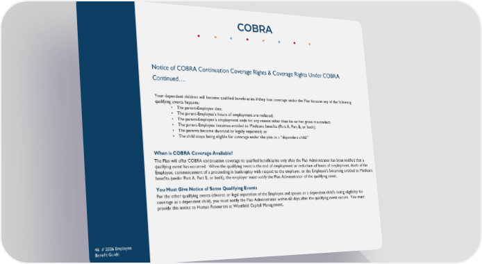 Notice of COBRA Continuation Coverage Rights & Coverage Rights Under COBRA Continued…. Your dependent children will become qualified beneficiaries if they lose coverage under the Plan because any of the following qualifying events happens: • The parent-Employee dies; • The parent-Employee’s hours of employment are reduced; • The parent-Employee’s employment ends for any reason other than his or her gross misconduct; • The parent-Employee becomes entitled to Medicare benefits (Part A, Part B, or both); • The parents become divorced or legally separated; or • The child stops being eligible for coverage under the plan as a “dependent child.” When is COBRA Coverage Available? The Plan will offer COBRA continuation coverage to qualified beneficiaries only after the Plan Administrator has been notified that a qualifying event has occurred. When the qualifying event is the end of employment or reduction of hours of employment, death of the Employee, commencement of a proceeding in bankruptcy with respect to the employer, or the Employee’s becoming entitled to Medicare benefits (under Part A, Part B, or both), the employer must notify the Plan Administrator of the qualifying event. You Must Give Notice of Some Qualifying Events For the other qualifying events (divorce or legal separation of the Employee and spouse or a dependent child’s losing eligibility for coverage as a dependent child), you must notify the Plan Administrator within 60 days after the qualifying event occurs. You must provide this notice to Human Resources at Westfield Capital Management. COBRA 46 // 2026 Employee Benefit Guide