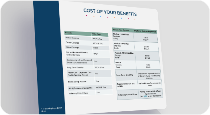 Benefit Who Pays Medical Coverage WCM & You Dental Coverage WCM & You Vision Coverage WCM Life and Accidental Death & Dismemberment WCM Supplemental Life and Accidental Death & Dismemberment You Long Term Disability WCM & You Health Care / Dependent Care Flexible Spending Account You Health Savings Account You 401(k) Retirement Savings Plan WCM & You Voluntary Critical Illness You Benefit Plan Options Employee Cost per Pay Period Medical - HMO Plan Employee Family $56.11 $150.77 Medical - PPO Plan Employee Family $172.97 $464.75 Medical - PPO HSA Plan Employee Family $54.34 $146.02 Dental Employee Family $3.86 $11.21 Long Term Disability Employees are responsible for 10% of the cost of Long Term Disability insurance. Supplemental Life and AD&D Age banded rates. See summary for details. Voluntary Critical Illness Monthly, Employee-Only & Family Age-banded rates. Click HERE to view the rate sheet. COST OF YOUR BENEFITS 4 // 2026 Employee Benefit Guide