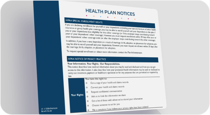 HEALTH PLAN NOTICES 21 // 2026 Employee Benefit Guide If you are declining enrollment for yourself or your dependents (including your spouse) because of other health insurance or group health plan coverage, you may be able to enroll yourself and your dependents in this plan if you or your dependents lose eligibility for that other coverage (or if the employer stops contributing toward your or your dependents’ other coverage). However, you must request enrollment within 30 days after your or your dependents’ other coverage ends (or after the employer stops contributing toward the other coverage). In addition, if you have a new dependent as a result of marriage, birth, adoption, or placement for adoption, you may be able to enroll yourself and your dependents. However, you must request enrollment within 30 days after the marriage, birth, adoption, or placement for adoption. To request special enrollment or obtain more information, contact the Plan Administrator. HIPAA SPECIAL ENROLLMENT RIGHTS HIPAA NOTICE OF PRIVACY PRACTICE Your Information. Your Rights. Our Responsibilities. This notice describes how medical information about you may be used and disclosed and how you can get access to this information. It also describes how your protected health information may be used or disclosed to carry out treatment, payment or healthcare operation or for any purposes that are permitted or required by law. Your Rights You have the right to: ❖ Get a copy of your health and claims records ❖ Correct your health and claims records ❖ Request confidential communication ❖ Ask us to limit the information we share ❖ Get a list of those with whom we’ve shared your information ❖ Choose someone to act for you ❖ File a complaint if you believe your privacy rights have been violated