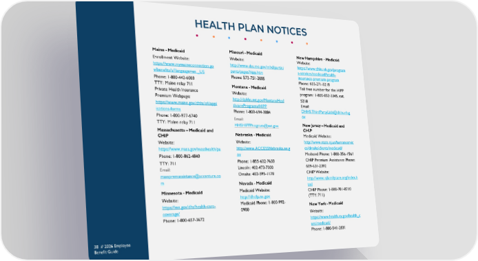 HEALTH PLAN NOTICES 38 // 2026 Employee Benefit Guide Maine - Medicaid Enrollment Website: https://www.mymaineconnection.go v/benefits/s/?language=en _US Phone: 1-800-442-6003 TTY: Maine relay 711 Private Health Insurance Premium Webpage: https://www.maine.gov/dhhs/ofi/appl ications-forms Phone: 1-800-977-6740 TTY: Maine relay 711 Massachusetts – Medicaid and CHIP Website: https://www.mass.gov/masshealth/pa Phone: 1-800-862-4840 TTY: 711 Email: masspremassistance@accenture.co m Minnesota - Medicaid Website: https://mn.gov/dhs/health-care- coverage/ Phone: 1-800-657-3672 Missouri - Medicaid Website: http://www.dss.mo.gov/mhd/partici pants/pages/hipp.htm Phone: 573-751-2005 Montana - Medicaid Website: http://dphhs.mt.gov/MontanaHeal thcarePrograms/HIPP Phone: 1-800-694-3084 Email: HHSHIPPProgram@mt.gov Nebraska - Medicaid Website: http://www.ACCESSNebraska.ne.g ov Phone: 1-855-632-7633 Lincoln: 402-473-7000 Omaha: 402-595-1178 Nevada - Medicaid Medicaid Website: http://dhcfp.nv.gov Medicaid Phone: 1-800-992- 0900 New Hampshire - Medicaid Website: https://www.dhhs.nh.gov/program s-services/medicaid/health- insurance-premium-program Phone: 603-271-5218 Toll free number for the HIPP program: 1-800-852-3345, ext. 5218 Email: DHHS.ThirdPartyLiabi@dhhs.nh.g ov New Jersey – Medicaid and CHIP Medicaid Website: http://www.state.nj.us/humanservic es/dmahs/clients/medicaid/ Medicaid Phone: 1-800-356-1561 CHIP Premium Assistance Phone: 609-631-2392 CHIP Website: http://www.njfamilycare.org/index.h tml CHIP Phone: 1-800-701-0710 (TTY: 711) New York - Medicaid Website: https://www.health.ny.gov/health_c are/medicaid/ Phone: 1-800-541-2831