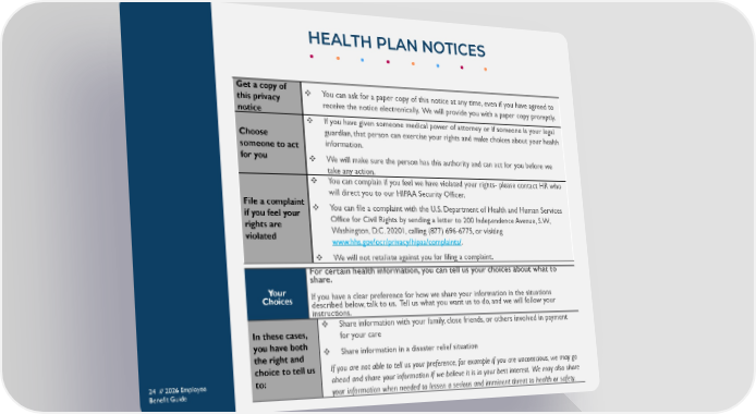 HEALTH PLAN NOTICES 24 // 2026 Employee Benefit Guide Get a copy of this privacy notice ❖ You can ask for a paper copy of this notice at any time, even if you have agreed to receive the notice electronically. We will provide you with a paper copy promptly. Choose someone to act for you ❖ If you have given someone medical power of attorney or if someone is your legal guardian, that person can exercise your rights and make choices about your health information. ❖ We will make sure the person has this authority and can act for you before we take any action. File a complaint if you feel your rights are violated ❖ You can complain if you feel we have violated your rights- please contact HR who will direct you to our HIPAA Security Officer. ❖ You can file a complaint with the U.S. Department of Health and Human Services Office for Civil Rights by sending a letter to 200 Independence Avenue, S.W., Washington, D.C. 20201, calling (877) 696-6775, or visiting www.hhs.gov/ocr/privacy/hipaa/complaints/. ❖ We will not retaliate against you for filing a complaint. Your Choices For certain health information, you can tell us your choices about what to share. If you have a clear preference for how we share your information in the situations described below, talk to us. Tell us what you want us to do, and we will follow your instructions. In these cases, you have both the right and choice to tell us to: ❖ Share information with your family, close friends, or others involved in payment for your care ❖ Share information in a disaster relief situation If you are not able to tell us your preference, for example if you are unconscious, we may go ahead and share your information if we believe it is in your best interest. We may also share your information when needed to lessen a serious and imminent threat to health or safety.