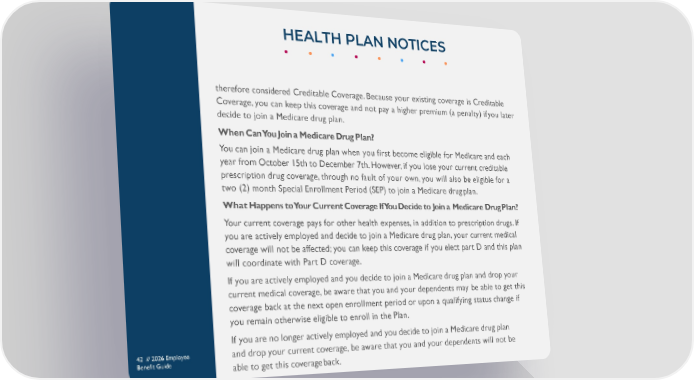 HEALTH PLAN NOTICES 42 // 2026 Employee Benefit Guide therefore considered Creditable Coverage. Because your existing coverage is Creditable Coverage, you can keep this coverage and not pay a higher premium (a penalty) ifyou later decide to join a Medicare drug plan. When Can You Join a Medicare Drug Plan? You can join a Medicare drug plan when you first become eligible for Medicare and each year from October 15th to December 7th. However, if you lose your current creditable prescription drug coverage, through no fault of your own, you will also be eligible for a two (2) month Special Enrollment Period (SEP) to join a Medicare drug plan. What Happens toYour Current Coverage IfYouDecide to Join a Medicare DrugPlan? Your current coverage pays for other health expenses, in addition to prescription drugs. If you are actively employed and decide to join a Medicare drug plan, your current medical coverage will not be affected; you can keep this coverage if you elect part D and this plan will coordinate with Part D coverage. If you are actively employed and you decide to join a Medicare drug plan and drop your current medical coverage, be aware that you and your dependents may be able to get this coverage back at the next open enrollment period or upon a qualifying status change if you remain otherwise eligible to enroll in the Plan. If you are no longer actively employed and you decide to join a Medicare drug plan and drop your current coverage, be aware that you and your dependents will not be able to get this coverageback.