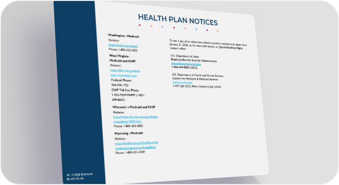 HEALTH PLAN NOTICES 40 // 2026 Employee Benefit Guide Washington - Medicaid Website: https://www.hca.wa.gov/ Phone: 1-800-562-3022 West Virginia - Medicaid and CHIP Website: https://dhhr.wv.gov/bms/ http://mywvhipp.com/ Medicaid Phone: 304-558-1700 CHIP Toll-free Phone: 1-855-MyWVHIPP (1-855- 699-8447) Wisconsin – Medicaid and CHIP Website: https://www.dhs.wisconsin.gov/badge rcareplus/p-10095.htm Phone: 1-800-362-3002 Wyoming - Medicaid Website: https://health.wyo.gov/healthcarefin/ medicaid/programs-and-eligibility/ Phone: 1-800-251-1269 To see if any other states have added a premium assistance program since January 31, 2026, or for more information on Special Enrollment Rights, contact either: U.S. Department of Labor Employee Benefits Security Administration www.dol.gov/agencies/ebsa 1-866-444-EBSA (3272) U.S. Department of Health and Human Services Centers for Medicare & Medicaid Services www.cms.hhs.gov 1-877-267-2323, Menu Option 4, Ext. 61565