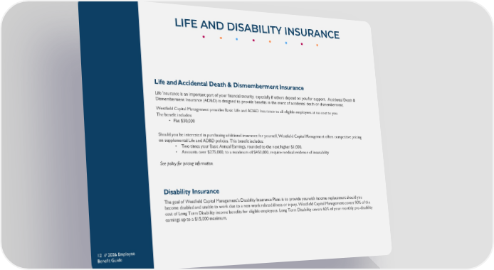 Life andAccidental Death & Dismemberment Insurance Life Insurance is an important part of your financial security, especially if others depend on you for support. Accidental Death & Dismemberment Insurance (AD&D) is designed to provide benefits in the event of accidental death or dismemberment. Westfield Capital Management provides Basic Life and AD&D Insurance to all eligible employees at no cost to you. The benefit includes: • Flat $50,000 Disability Insurance The goal of Westfield Capital Management’s Disability Insurance Plans is to provide you with income replacement should you become disabled and unable to work due to a non‐work related illness or injury. Westfield Capital Management covers 90% of the cost of Long Term Disability income benefits for eligible employees. Long Term Disability covers 60% of your monthly pre-disability earnings up to a $15,000 maximum. Should you be interested in purchasing additional insurance for yourself, Westfield Capital Management offers competitive pricing on supplemental Life and AD&D policies. This benefit includes: • Two times your Basic Annual Earnings, rounded to the next higher $1,000. • Amounts over $275,000, to a maximum of $450,000, require medical evidence of insurability See policy for pricing information. LIFE AND DISABILITY INSURANCE 12 // 2026 Employee Benefit Guide