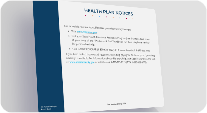 HEALTH PLAN NOTICES 44 // 2026 Employee Benefit Guide For more information about Medicare prescription drug coverage: • Visit www.medicare.gov • Call your State Health Insurance Assistance Program (see the inside back cover of your copy of the “Medicare & You” handbook for their telephone number) for personalized help. • Call 1-800-MEDICARE (1-800-633-4227).TTY users should call 1-877-486-2048. If you have limited income and resources, extra help paying for Medicare prescription drug coverage is available. For information about this extra help, visit Social Security on the web at www.socialsecurity.gov, or call them at 1-800-772-1213 (TTY 1-800-325-0778). Last updated: January 2026