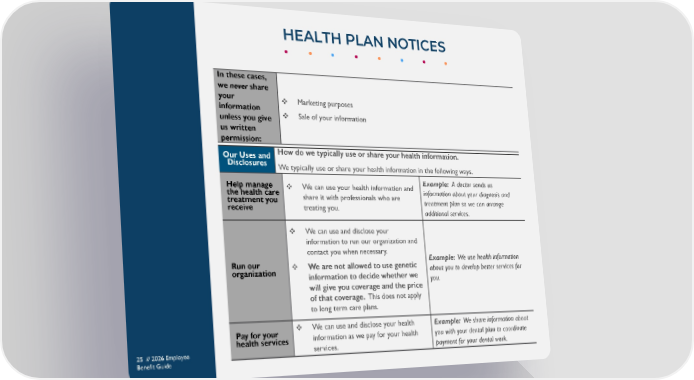 HEALTH PLAN NOTICES 25 // 2026 Employee Benefit Guide In these cases, we never share your information unless you give us written permission: ❖ Marketing purposes ❖ Sale of your information Our Uses and Disclosures How do we typically use or share your health information. We typically use or share your health information in the following ways. Help manage the health care treatment you receive ❖ We can use your health information and share it with professionals who are treating you. Example: A doctor sends us information about your diagnosis and treatment plan so we can arrange additional services. Run our organization ❖ We can use and disclose your information to run our organization and contact you when necessary. ❖ We are not allowed to use genetic information to decide whether we will give you coverage and the price of that coverage. This does not apply to long term care plans. Example: We use health information about you to develop better services for you. Pay for your health services ❖ We can use and disclose your health information as we pay for your health services. Example: We share information about you with your dental plan to coordinate payment for your dental work.