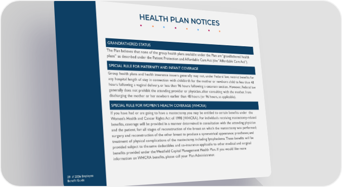 HEALTH PLAN NOTICES 29 // 2026 Employee Benefit Guide GRANDFATHERED STATUS The Plan believes that none of the group health plans available under the Plan are “grandfathered health plans” as described under the Patient Protection and Affordable Care Act (the “Affordable Care Act”). Group health plans and health insurance issuers generally may not, under Federal law, restrict benefits for any hospital length of stay in connection with childbirth for the mother or newborn child to less than 48 hours following a vaginal delivery, or less than 96 hours following a cesarean section. However, Federal law generally does not prohibit the attending provider or physician, after consulting with the mother, from discharging the mother or her newborn earlier than 48 hours (or 96 hours, as applicable). SPECIAL RULE FOR MATERNITY AND INFANT COVERAGE SPECIAL RULE FOR WOMEN’S HEALTH COVERAGE (WHCRA) If you have had or are going to have a mastectomy, you may be entitled to certain benefits under the Women's Health and Cancer Rights Act of 1998 (WHCRA). For individuals receiving mastectomy-related benefits, coverage will be provided in a manner determined in consultation with the attending physician and the patient, for: all stages of reconstruction of the breast on which the mastectomy was performed; surgery and reconstruction of the other breast to produce a symmetrical appearance; prostheses; and treatment of physical complications of the mastectomy, including lymphedema. These benefits will be provided subject to thesame deductibles and co-insurance applicable to other medical and surgical benefits provided under the Westfield Capital Management Health Plan. If you would like more information on WHCRA benefits, please call your Plan Administrator.