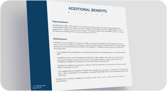Tuition Assistance Westfield Capital offers tuition assistance for employees who wish to enroll in job-related degreed graduate and undergraduate programs at accredited institutions. Employees will be eligible to enroll in an MBA program or a CFA program after 6 months of service with the Company. The maximum annual benefit is $10,000 for a full-time employee and will be pro-rated for part-time employees working over 20 hours. CFA Assistance The Boston Security Analysts Society sponsors weekly course work for candidates who wish to apply for the three levels of examinations leading to the designation of Chartered Financial Analyst. Westfield wishes to encourage qualified employees to take the examinations and seek the CFA designation. Westfield will assist employees, governed by the following policies: • The candidates will be reimbursed for fees, books and materials for the weekly preparatory courses sponsored by BSAS. • Westfield will pay for the first examination at each level for each candidate. If successful, the candidate will be reimbursed for similar expenses at the next level. If the candidate wishes to re-take an exam a second time, Westfield will reimburse the candidate for the exam fee if he/she successfully passes. • Westfield will reimburse an employee for exam fees, books and materials, and weekly prep courses sponsored by BSAS for each level of the CFA. • If the candidate fails an examination, Westfield will not reimburse for expenses for re-examination at the level of the failure. Upon re-examination, if the candidate is successful, Westfield will reimburse for the examination at the next higher level. Westfield will not reimburse candidates for secondary courses, “cram” courses or other course work, except as described above. ADDITIONAL BENEFITS 19 // 2026 Employee Benefit Guide